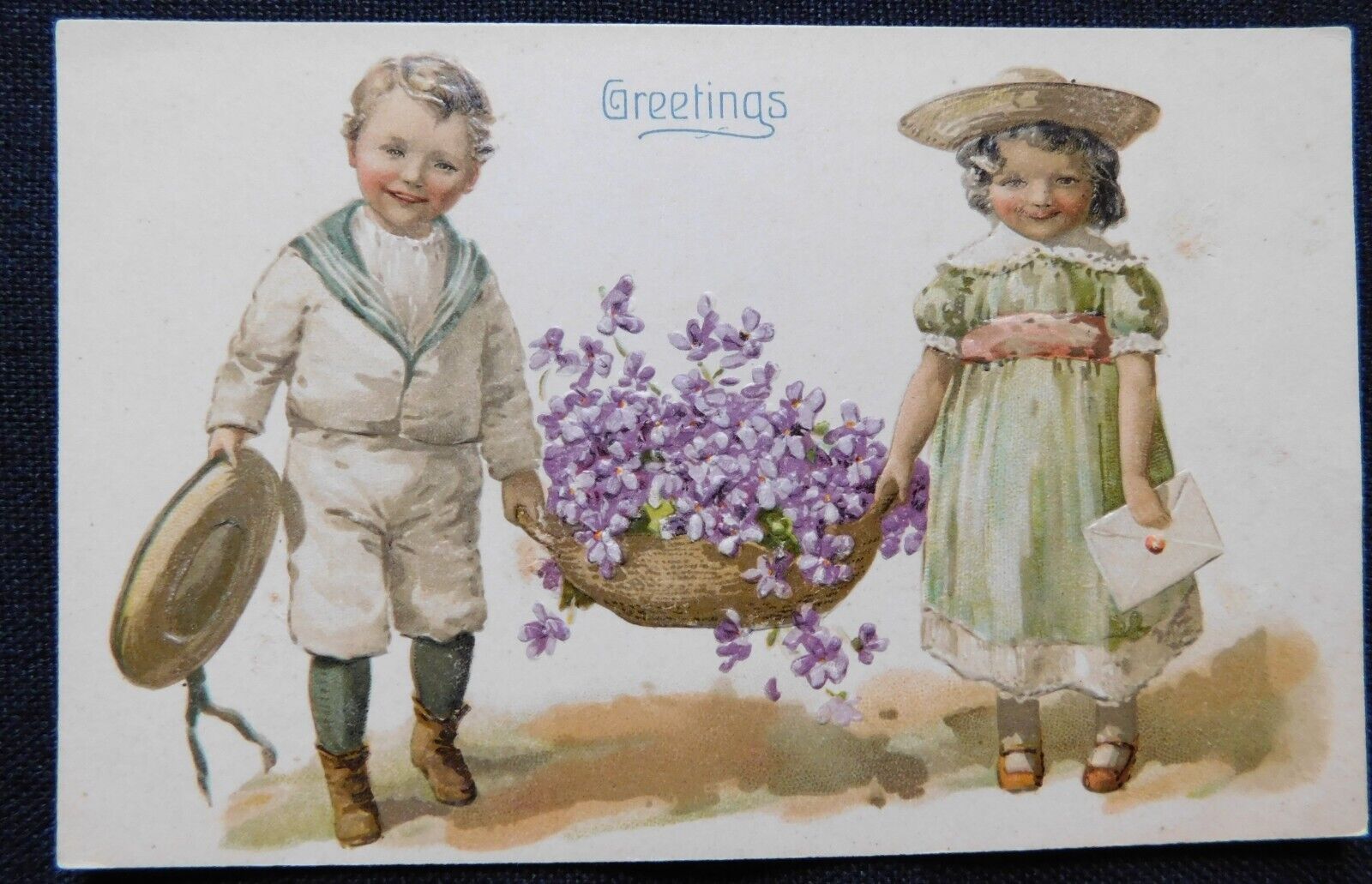 Title (ebay affiliate link): Antique greeting postcard c1910 Children carrying basket of flowers