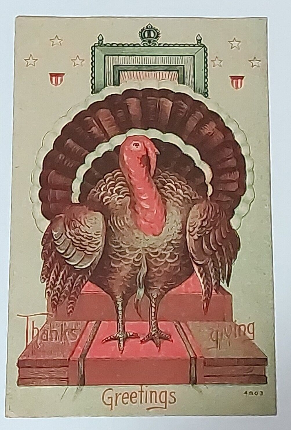 ANTIQUE THANKSGIVING GREETINGS PATRIOTIC POSTCARD WITH TURKEY pencil unposted