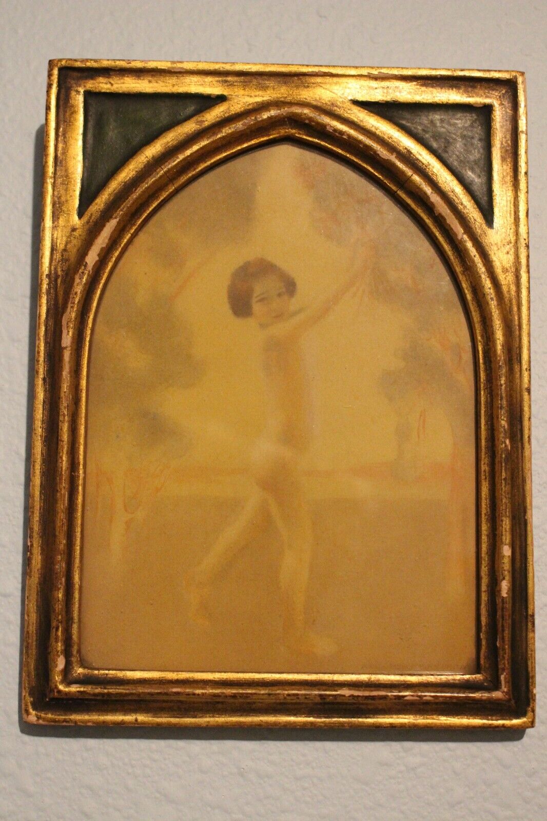 Antique nude Cherub Watercolor painting in arched Gilt Gesso Wood Frame