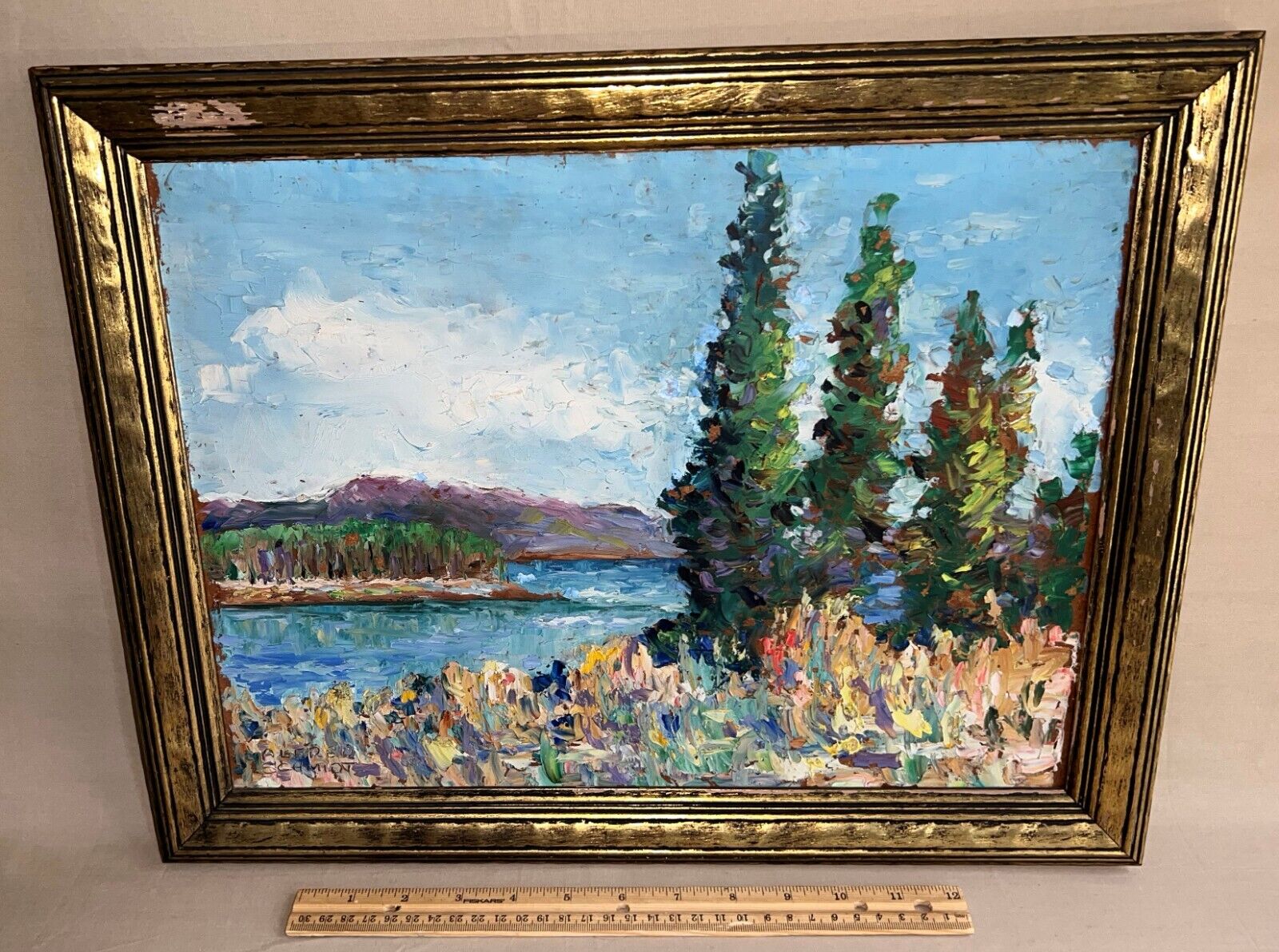 Title (ebay affiliate link): Antique Alfred G Schmidt Impressionist Oil Painting Outdoor Mountain Lake Scene