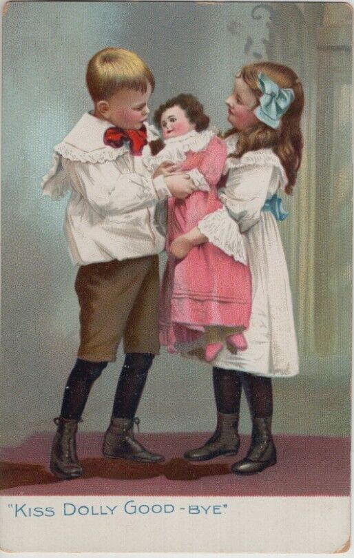Title (ebay affiliate link): ANTIQUE RAPHAEL TUCK 34LITTLE MEN AND WOMEN34 Postcard 34KISS DOLLY GOODBYE34