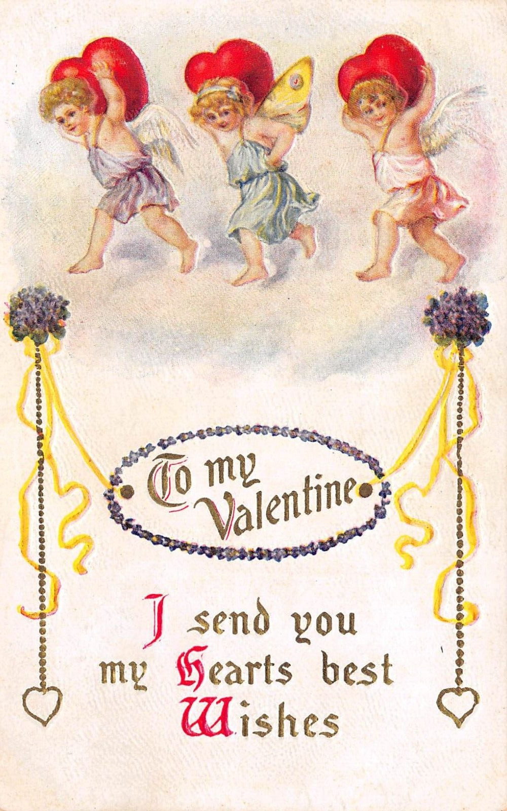 C9295 34To my Valentine34 3 Cupids Carry Red Hearts Antique Postcard Embossed
