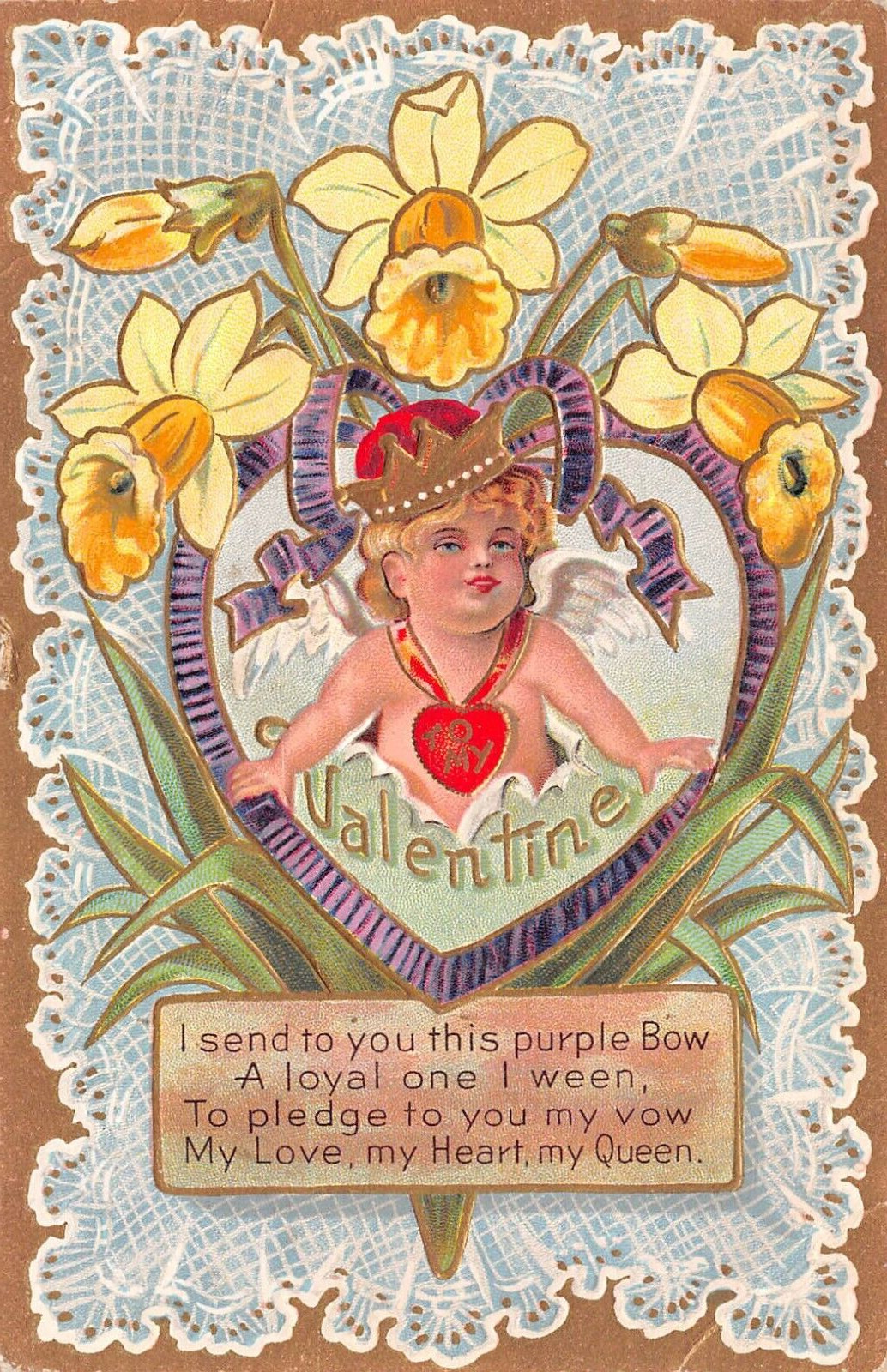Title (ebay affiliate link): C9321 34Valentine34 Cupid in Heart Daffodils Lace Rhyme Antique Postcard Embossed