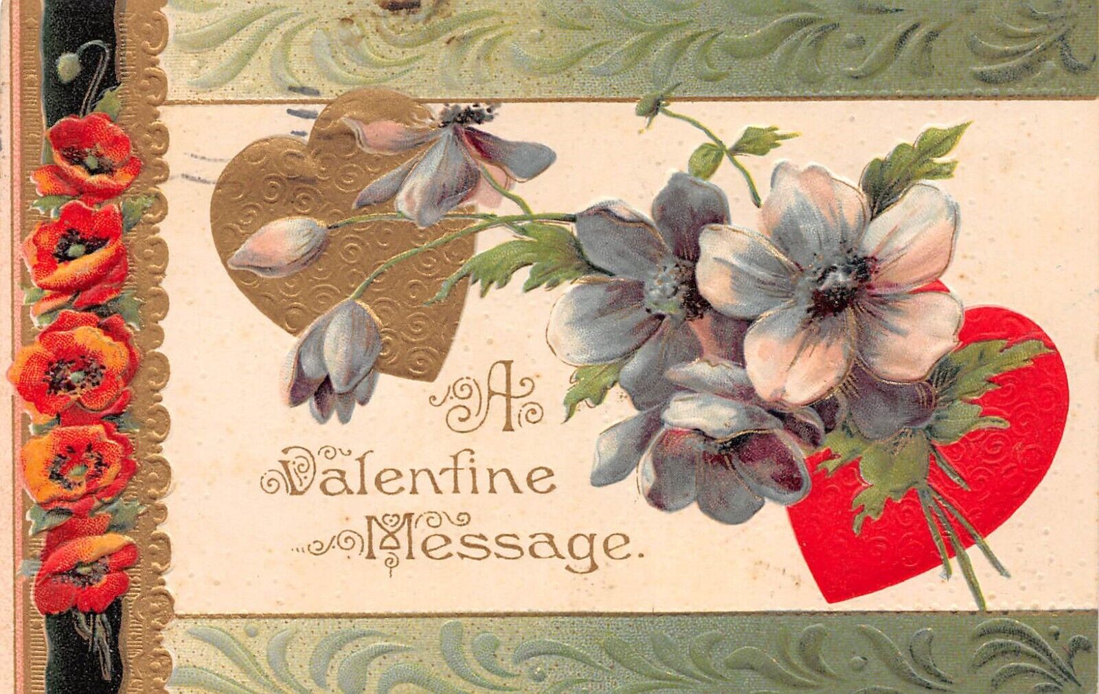 C9347 34A Valentine Message34 Flowers Red Heart Gold Heart Antique Postcard Emb.