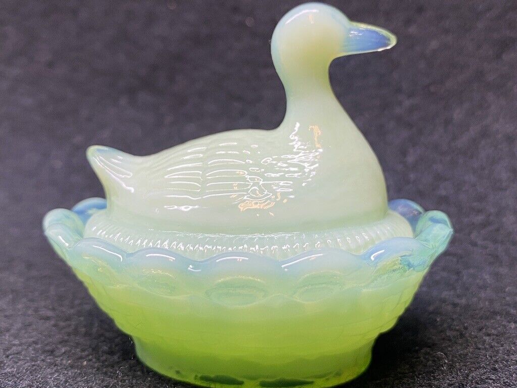 Title (ebay affiliate link): Jadeite Green Milk glass Duck Swan on nest basket Easter eggs salt cellar hen 23