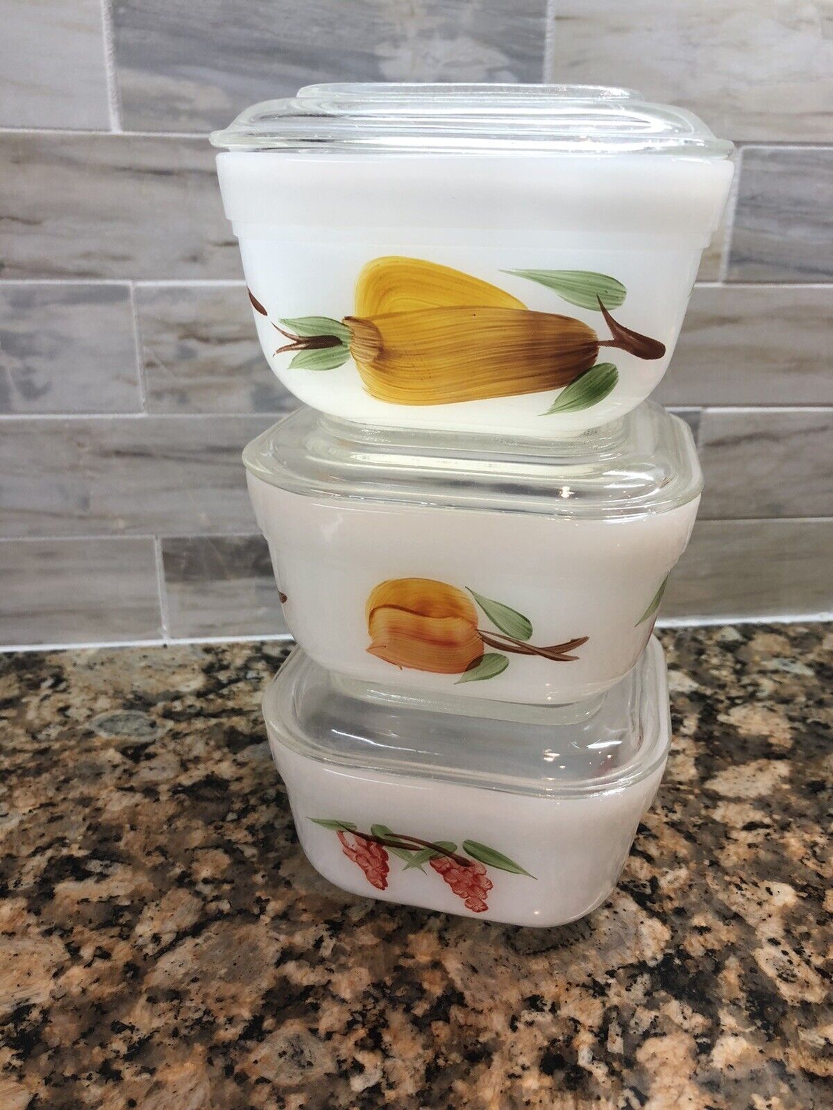 Set 3 Vintage Fire King Gay Fad Painted Fruit Refrigerator Dish Container w Li