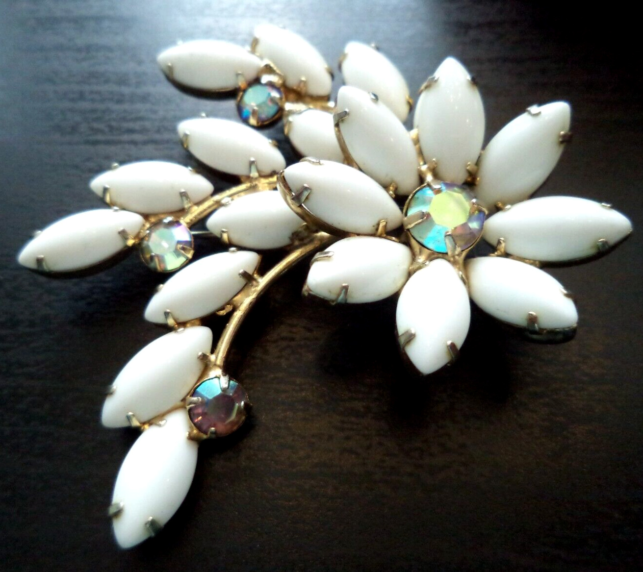 Title (ebay affiliate link): RARE VINTAGE JULIANA DE AB RHINESTONE MILK GLASS FLOWER 2 5/834 BROOCH G65