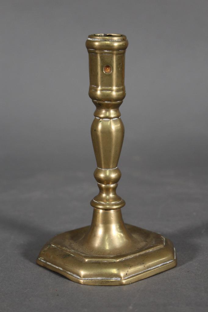 RARE LATE 17TH C SPANISH BRASS CANDLESTICK WITH A FACETED STEM AND CANDLE C
