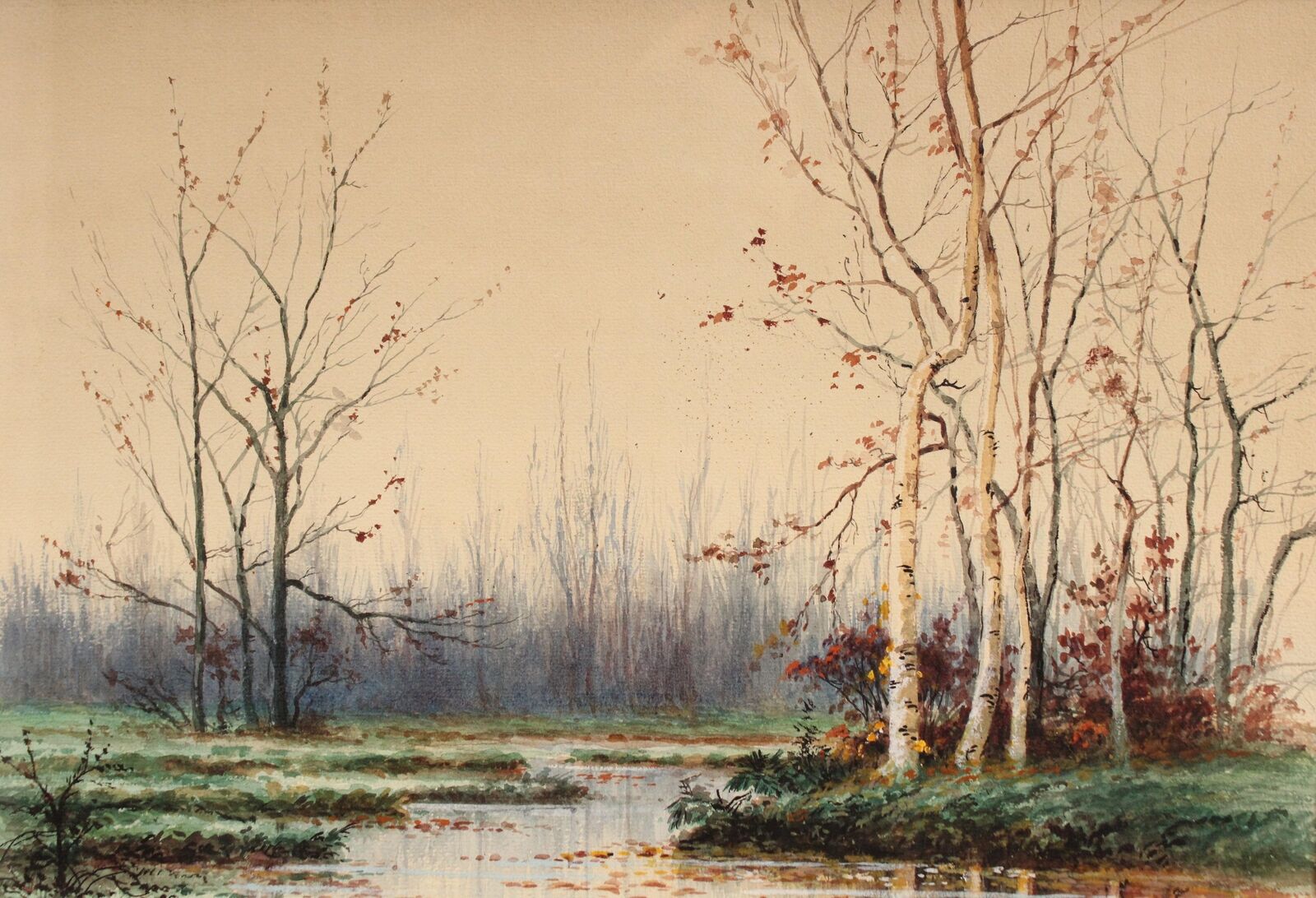 Antique American Watercolor Painting 1930 Signed Birch Tree River Landscape