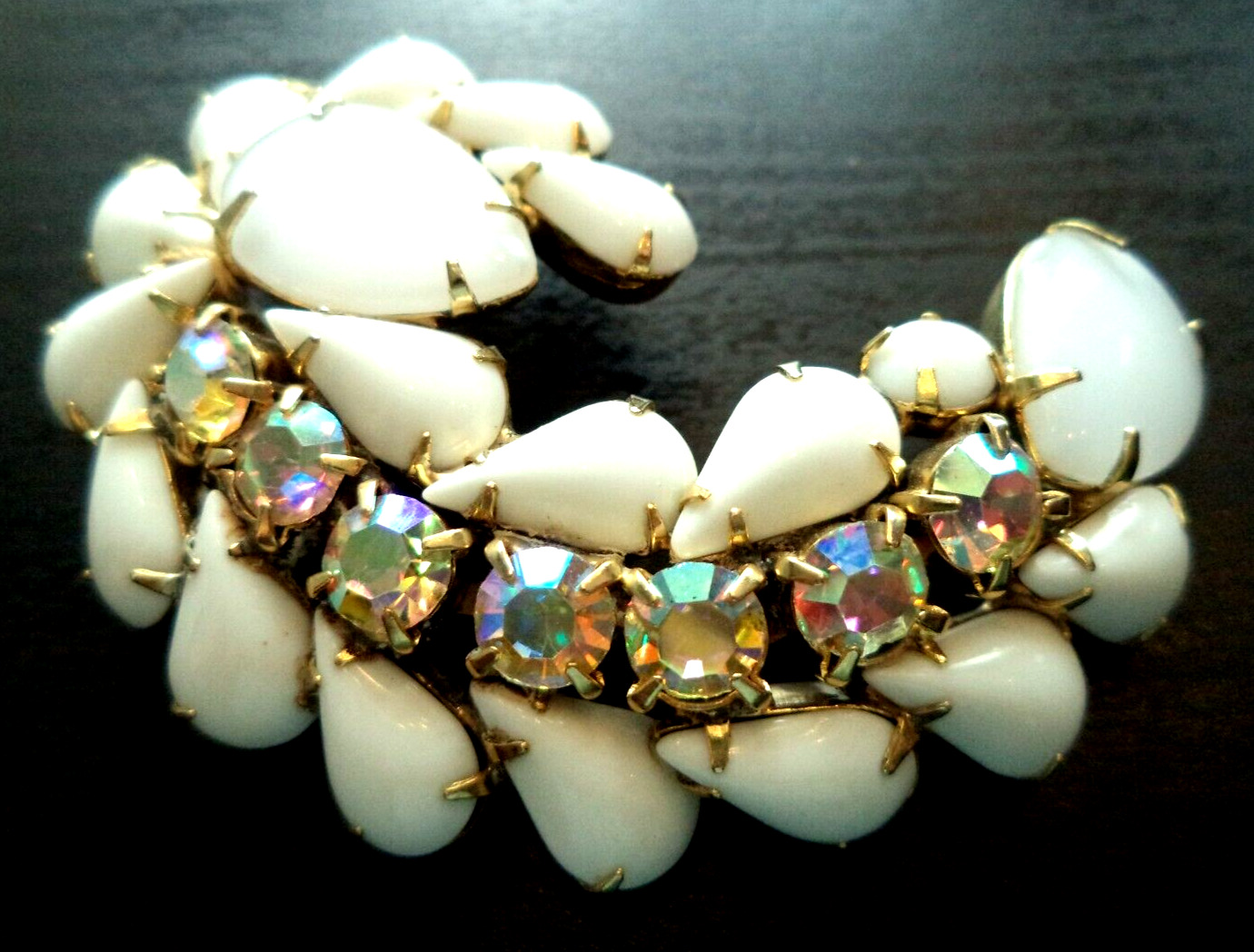 Title (ebay affiliate link): RARE VINTAGE JULIANA DE AB RHINESTONE MILK GLASS FLOWER 2.534 BROOCH G65
