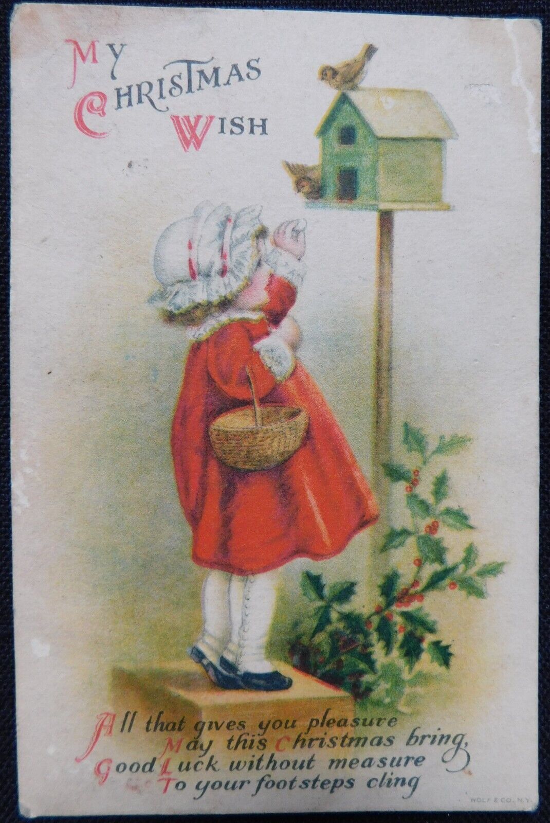 1919 Antique Christmas postcard Wolf Co Clapsaddle Girl in red dre