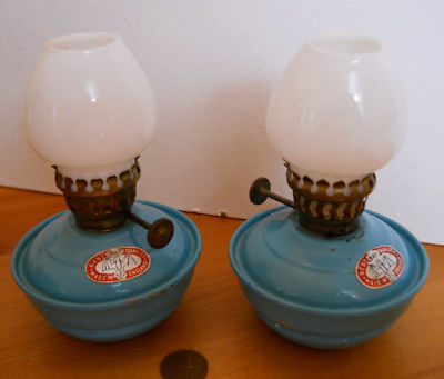2 Vtg Mini Blue Oil Lamps English Milkglass Shade