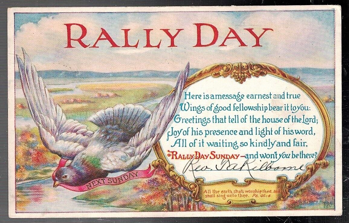 Title (ebay affiliate link): ANTIQUE 1920 SUNDAY SCHOOL RALLY DAY DOVE FLIES WITH RIBBON POSTCA
