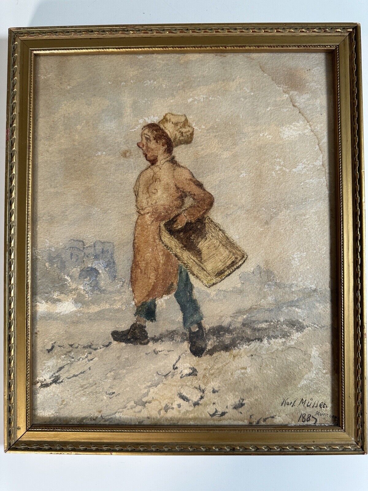 Title (ebay affiliate link): 19th Century Antique Watercolor Portrait Man Chef Apron Hat Baker Bread Germa