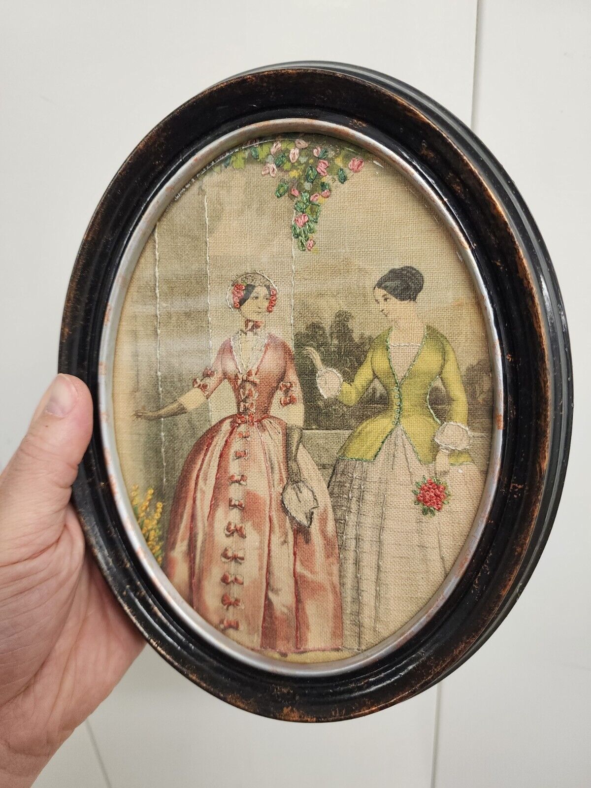 Original Oil Painting Canvas? Fabic ?? Woman Antique Stitching Needlepoint