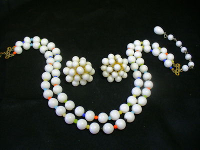 2Strd MILK GLASS Choker Necklace Clip On Earrings SET