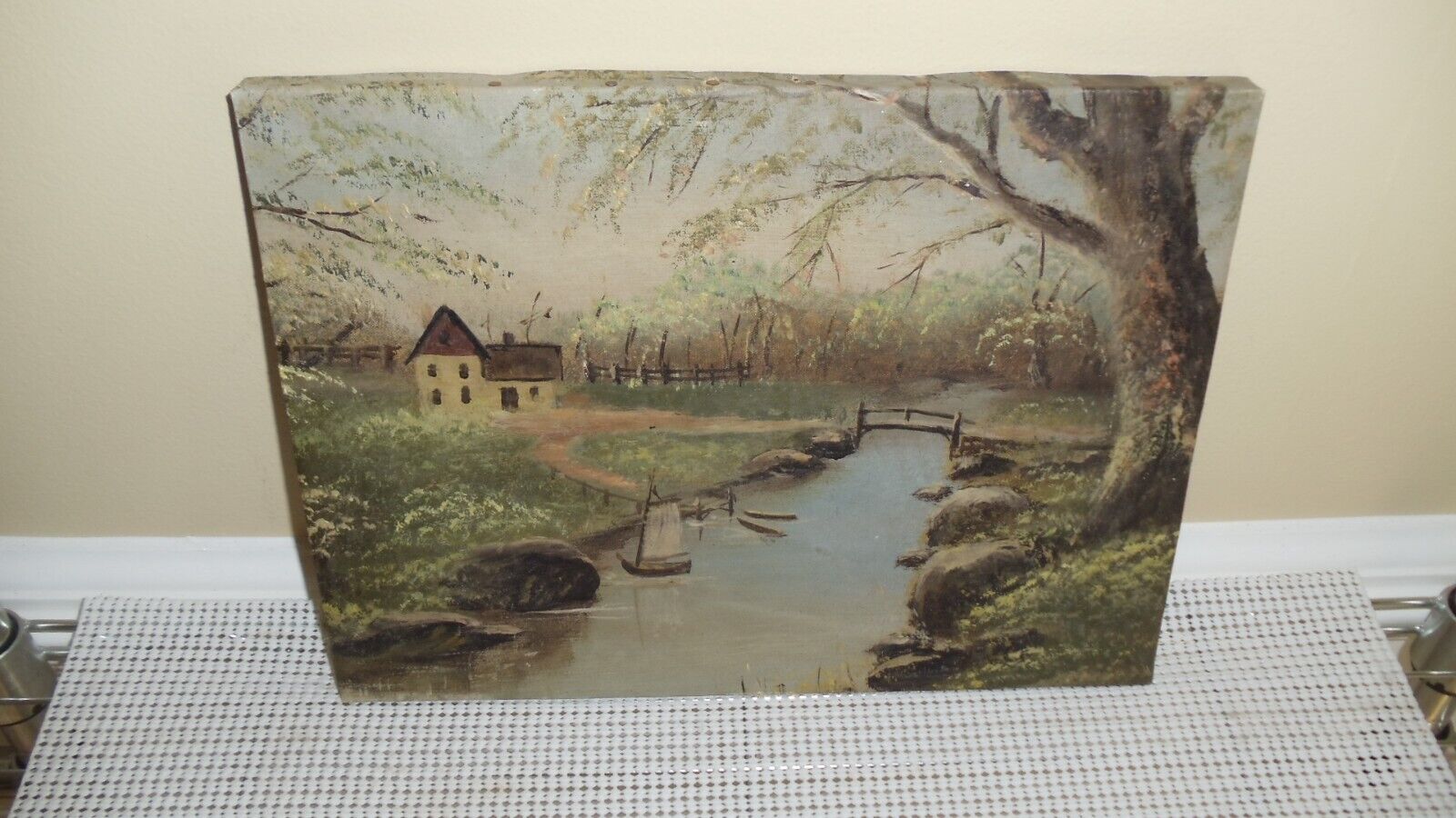 Title (ebay affiliate link): Antique Dutch Canal Landscape Oil Painting on Canvas Stretcher 9 X 12 inch