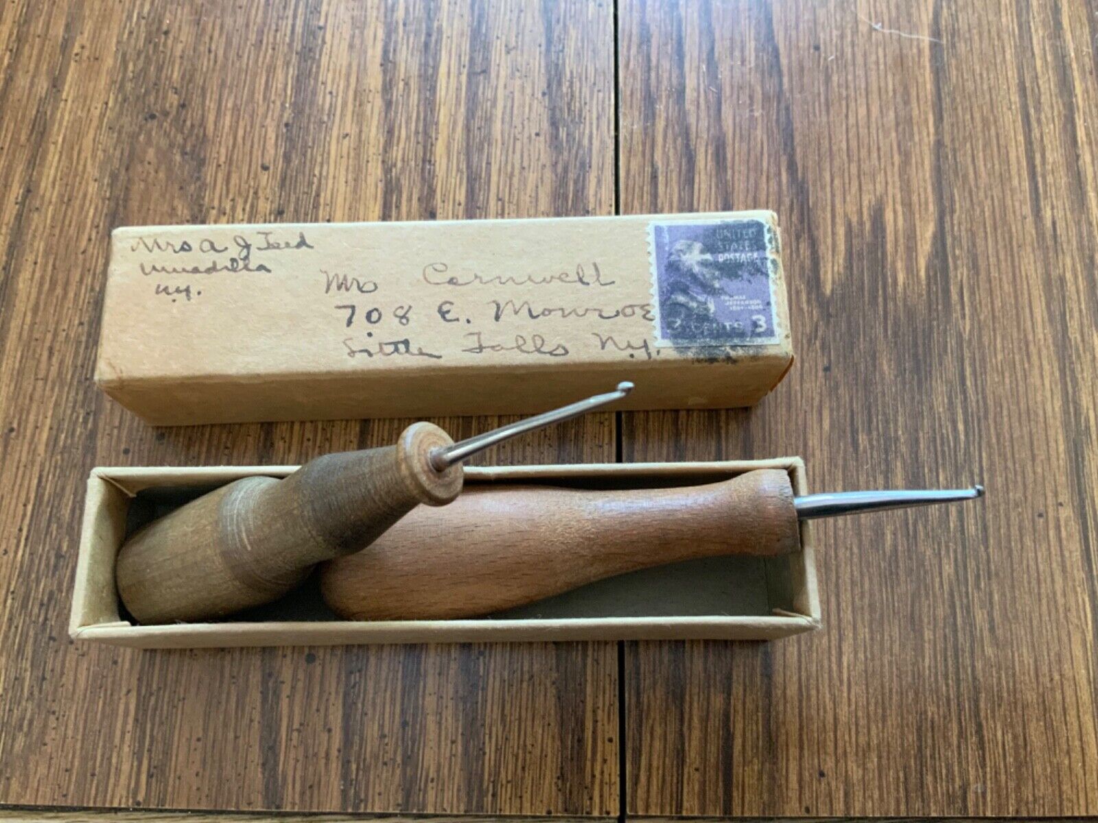 2 PRIMITIVE RUG HOOKS WOOD HANDLE IN VINTAGE BOX ESTATE FI