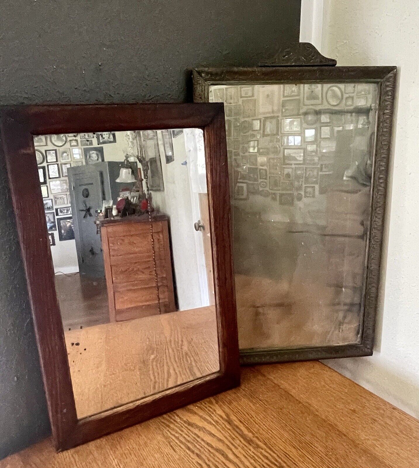 2 Antique Art Deco Wooden Framed Hanging Mirrors Distressed Wavy Glass Orna