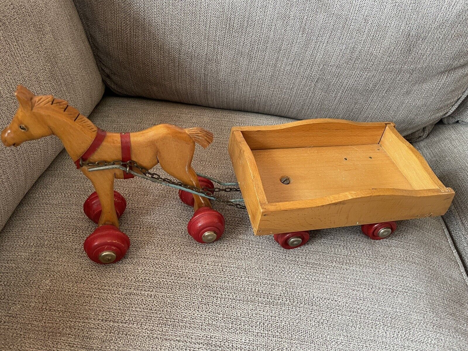 Antique VTG carved Wooden Horse Childs Pull Toy cart No Reserv