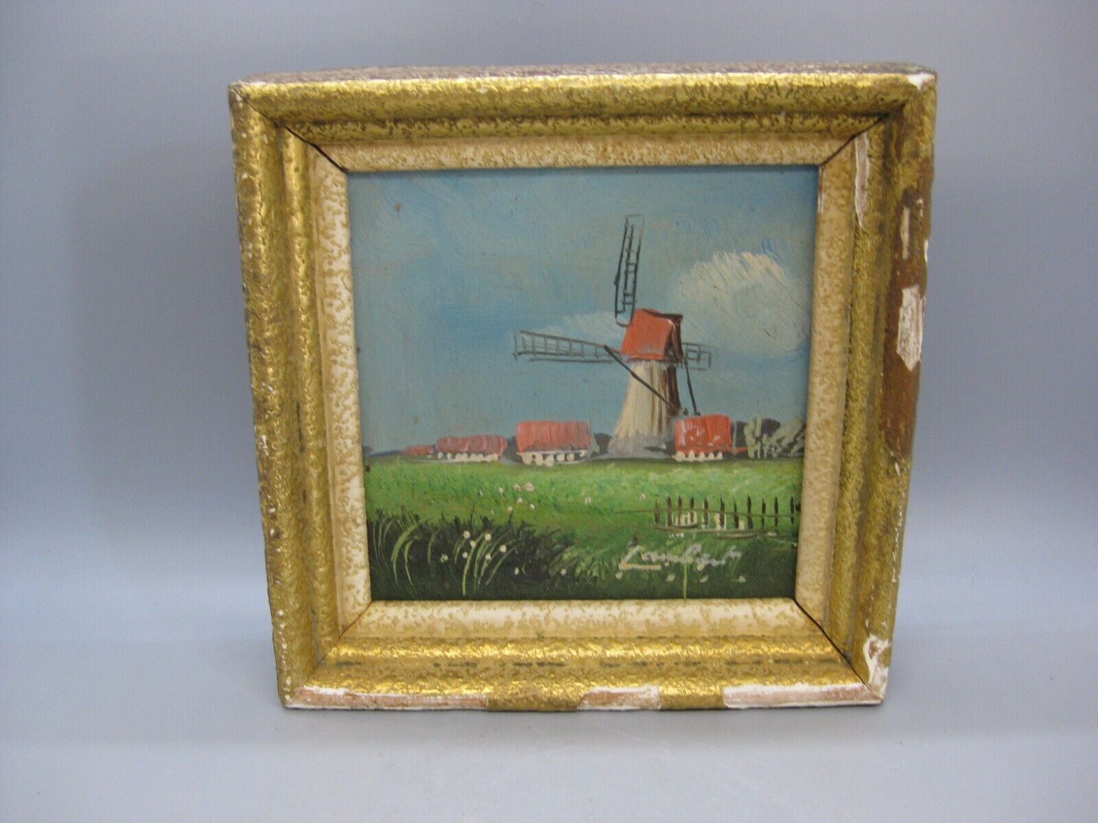 Title (ebay affiliate link): Antique French Artist Lambert Miniature Oil Painting Dutch Countryside Windmi