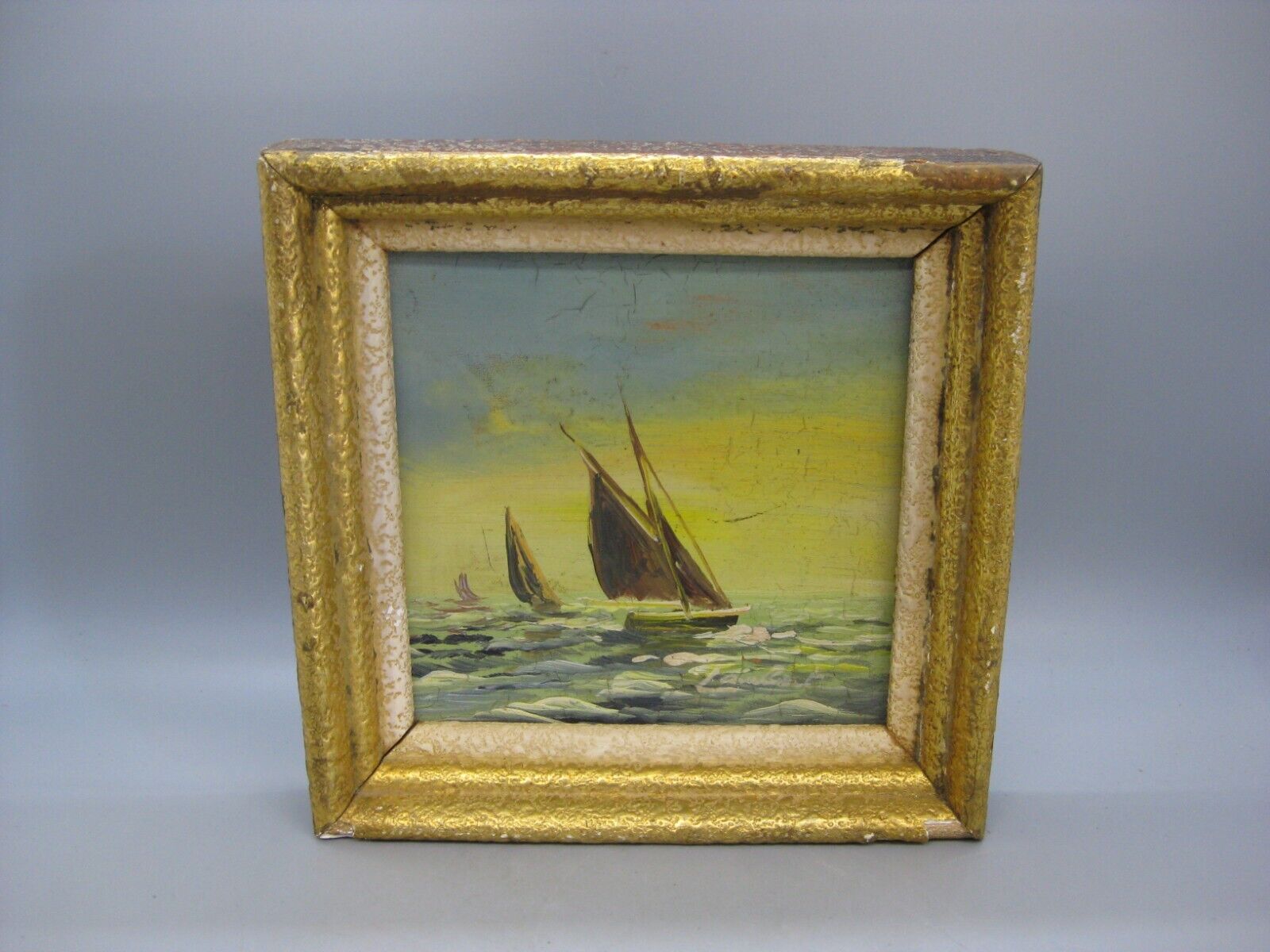 Antique French Artist Lambert Miniature Impressionist Seascape Boat Oil Painti