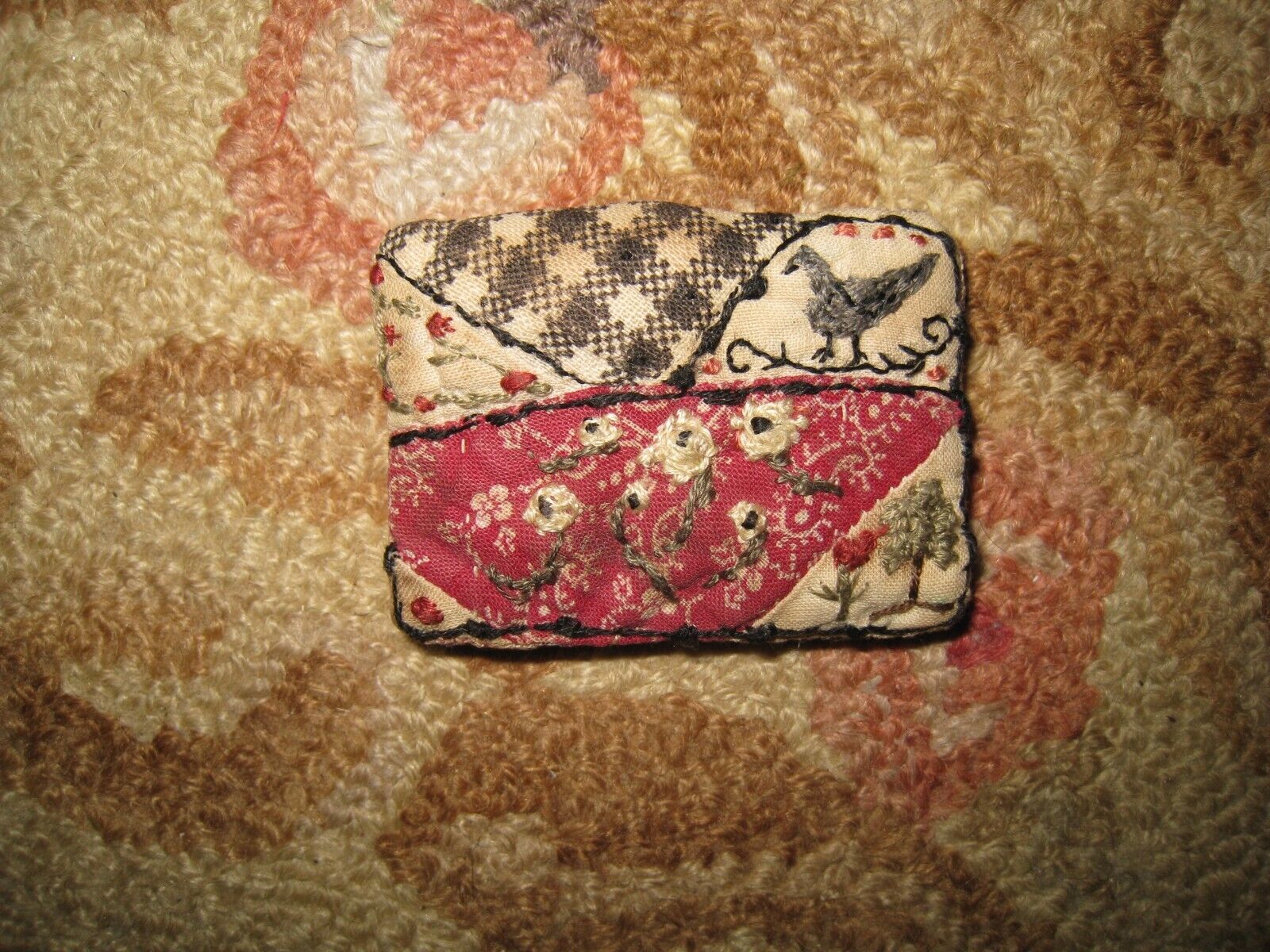 Title (ebay affiliate link): Primitive tiny Sampler Pillow Little Bird FlowersEarly Quilt TextileFolk A