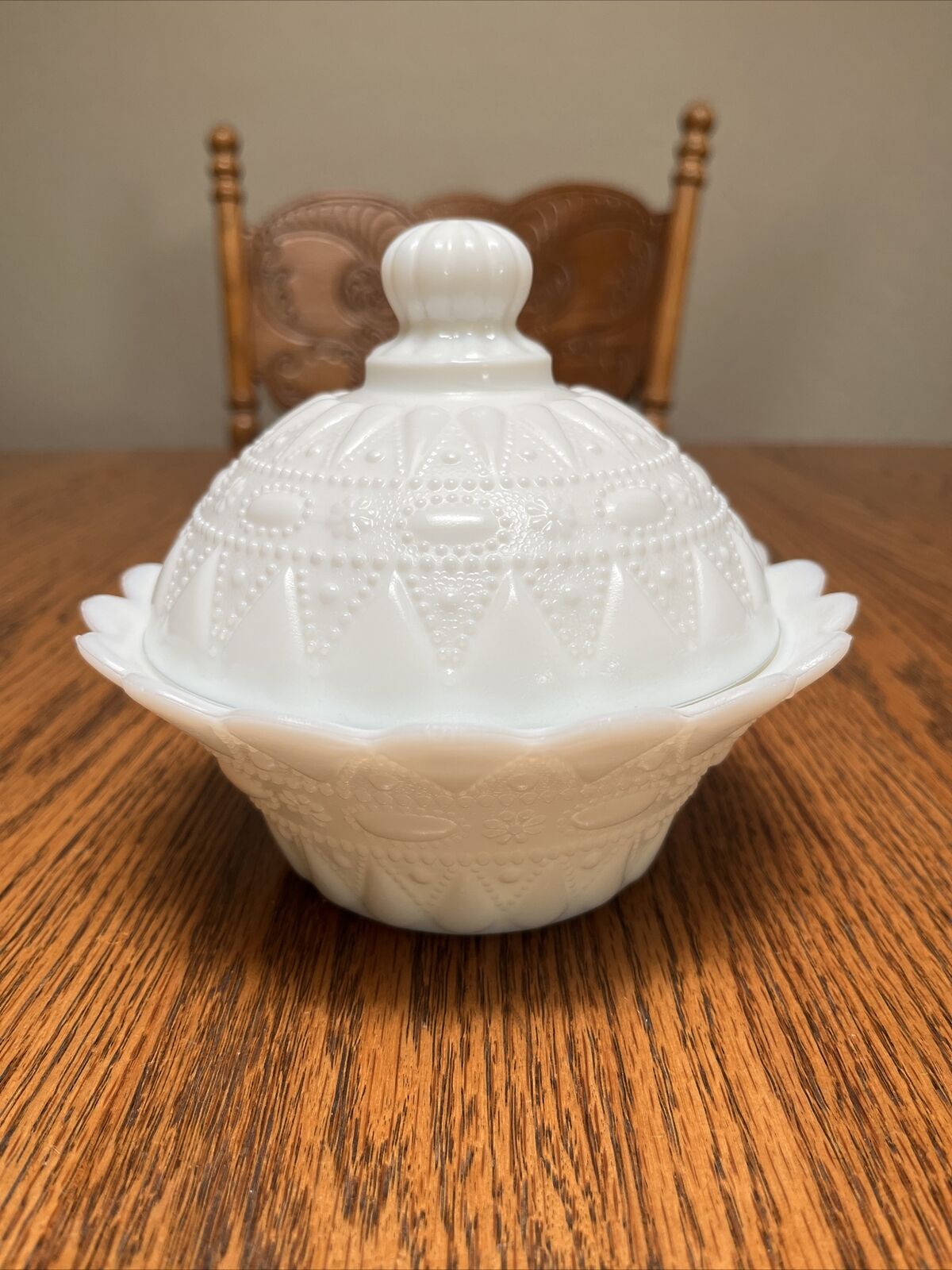 John E. Kemple Milk Glass Intrigue Pattern Candy Dish with Lid 1960s Vinta