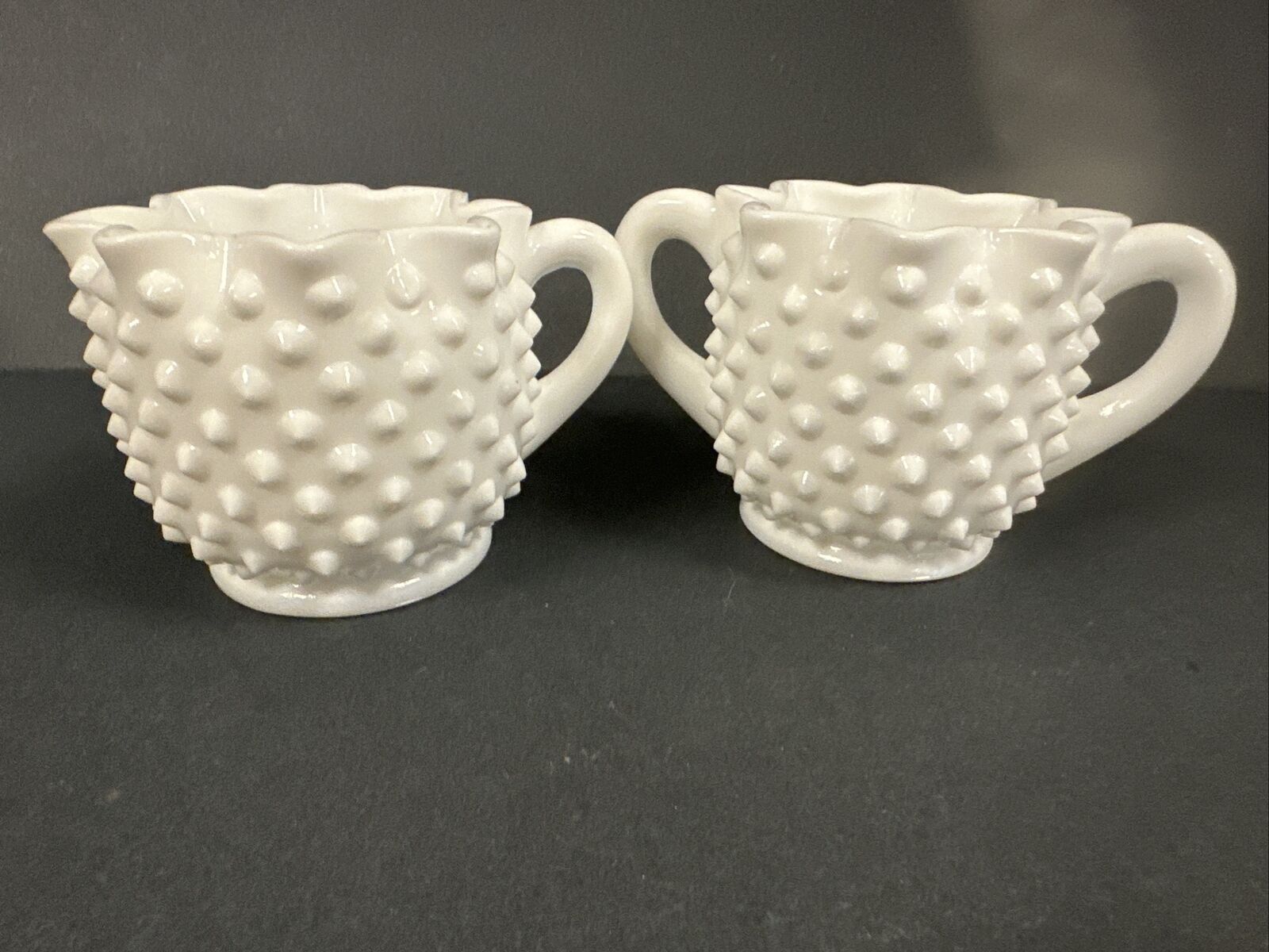 Title (ebay affiliate link): VTG FENTON? HOBNAIL MILK GLASS HANDLED CREAM SUGAR CRIMPED RIMS MINT CON