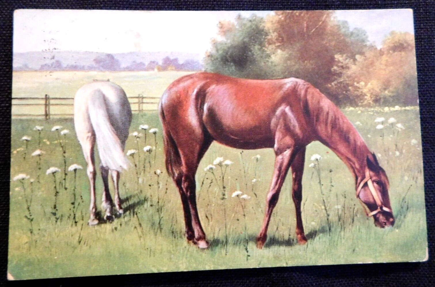 Antique greeting postcard 1907 Brown and white horses grazing in fie