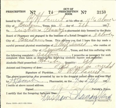 Title (ebay affiliate link): Antique 1927 PROHIBITION WHISKEY PRESCRIPTION Texas Rx