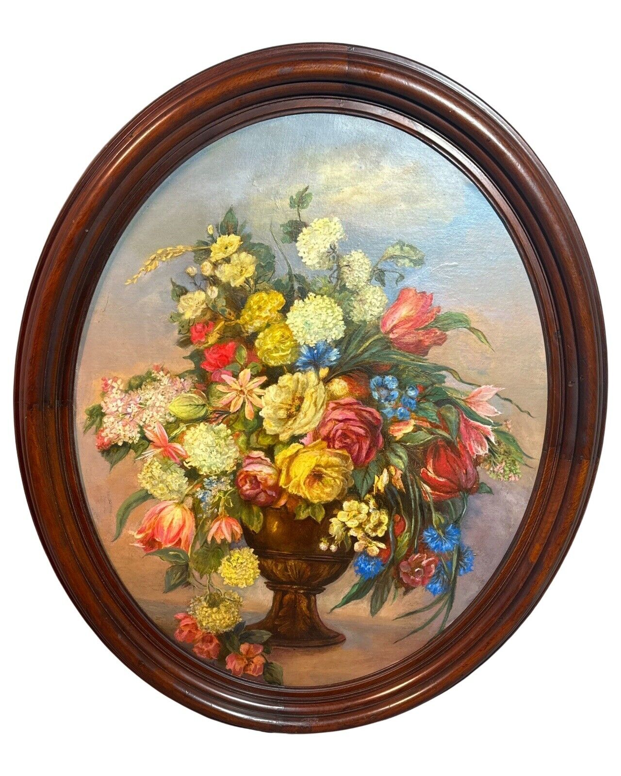 Vintage MCM Oval STILL LIFE Old URN of FLOWERS Botanical OIL PAINTING Wood Fra