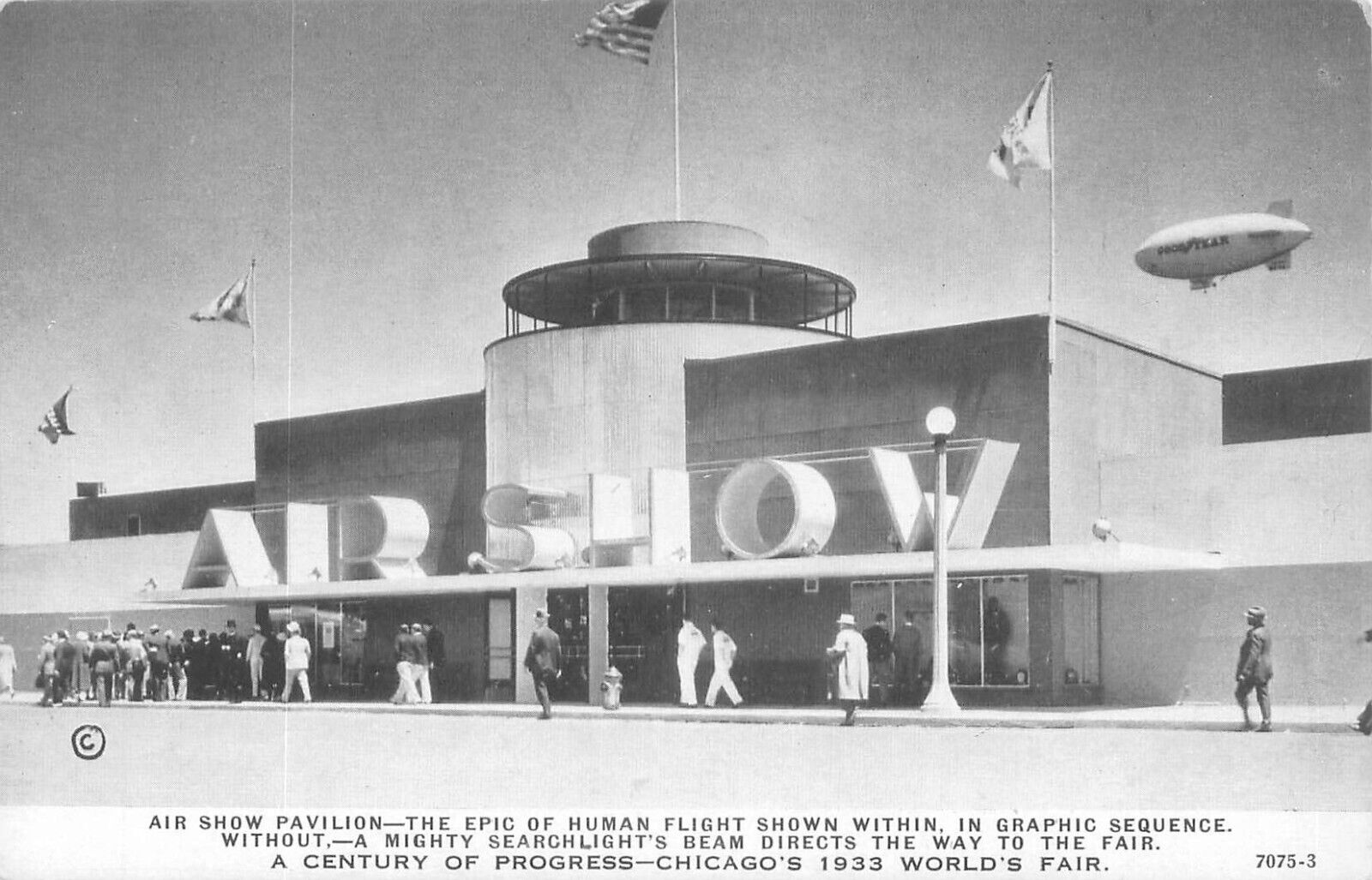 Title (ebay affiliate link): 1933 Chicago Worlds Fair Air Show Pavilion Blimp BW Childs Postcard Unus