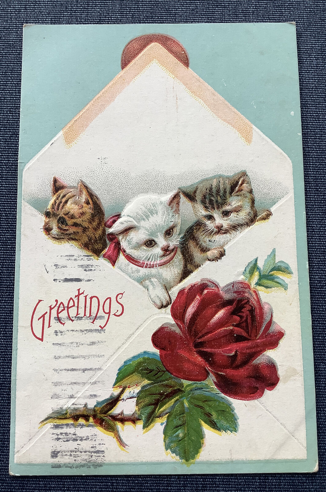 Title (ebay affiliate link): Vintage Embossed Cats Kittens In Envelope Postcard Red Rose Antiqu