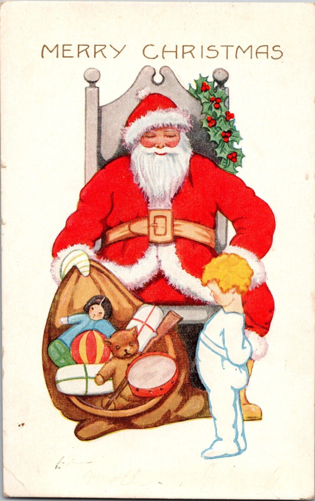 Antique Christmas Postcard Whitney Santa Classic Seated Blonde Child PJs Toy B