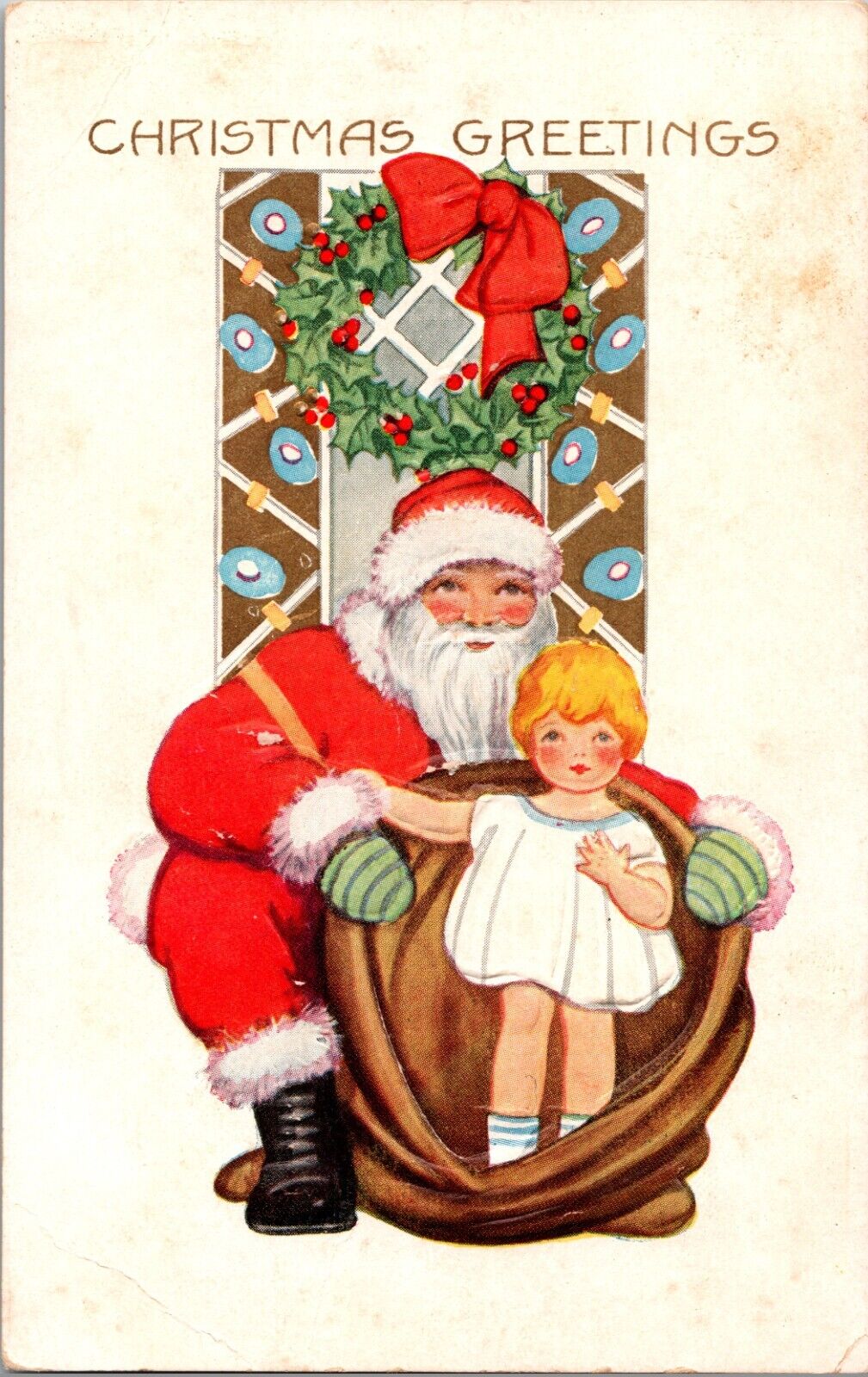 Antique Christmas Postcard Whitney Santa Cute Girl White Dress Stands In B