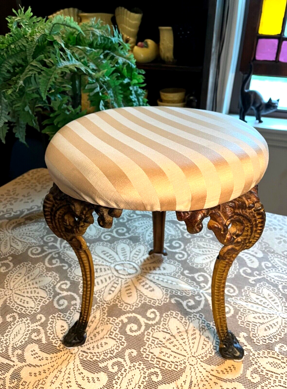 VINTAGE VICTORIAN ORNATE GOLD IRON FOOT STOOL W/STRIPED FABRIC COVER V