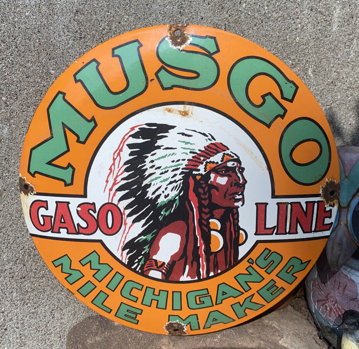 12” RARE MUSGO PORCELAIN DOMED OIL GAS PUMP PLATE MICHIGAN’S MILE MAKER SI