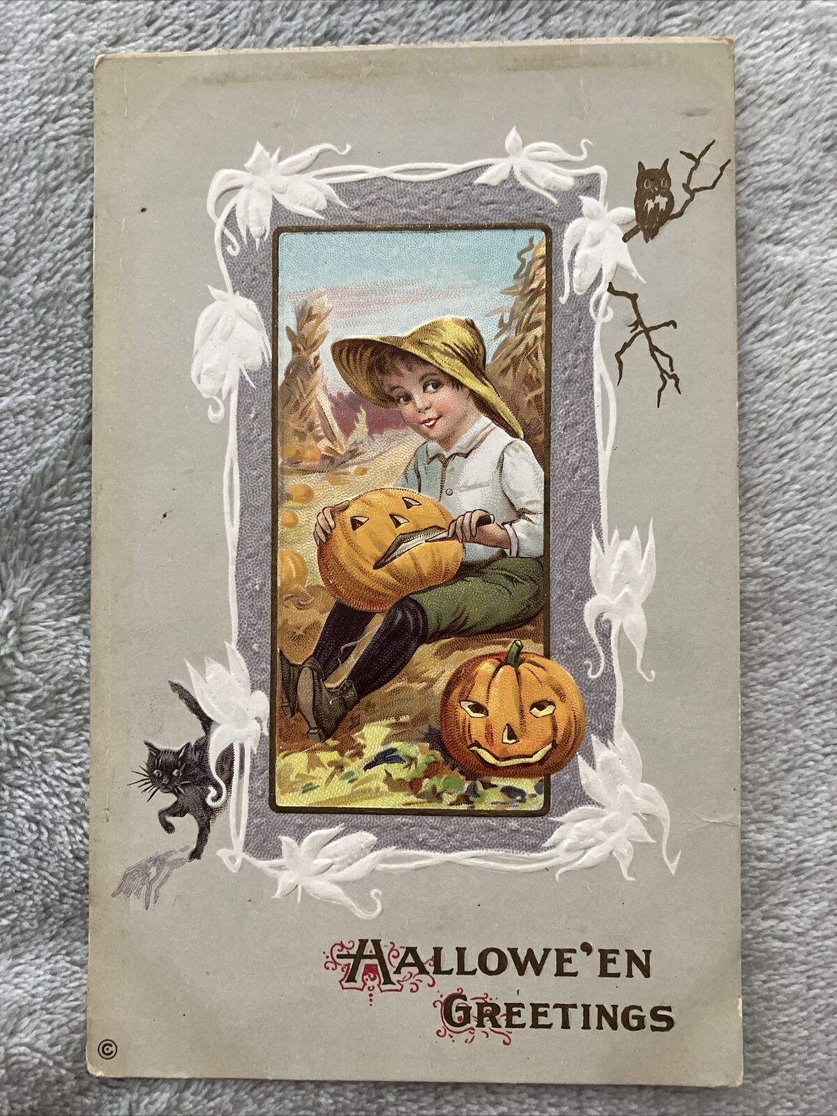 Title (ebay affiliate link): Antique Halloween Postcard Kid Carving Pumpkins Series 345