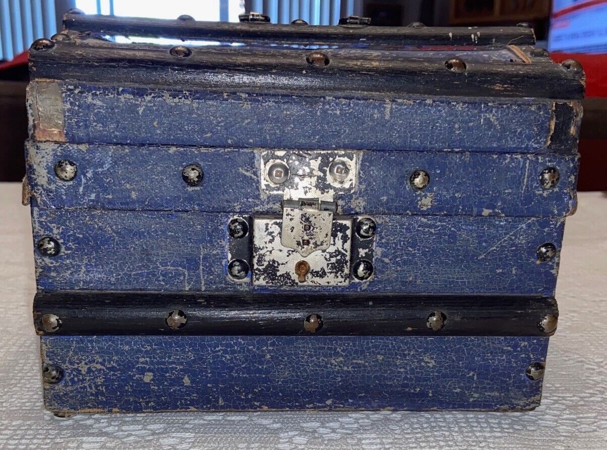 Antique WoodOil Cloth Brass SALESMAN SAMPLE Steamer DOMED TRUNK Box DOLL CHE