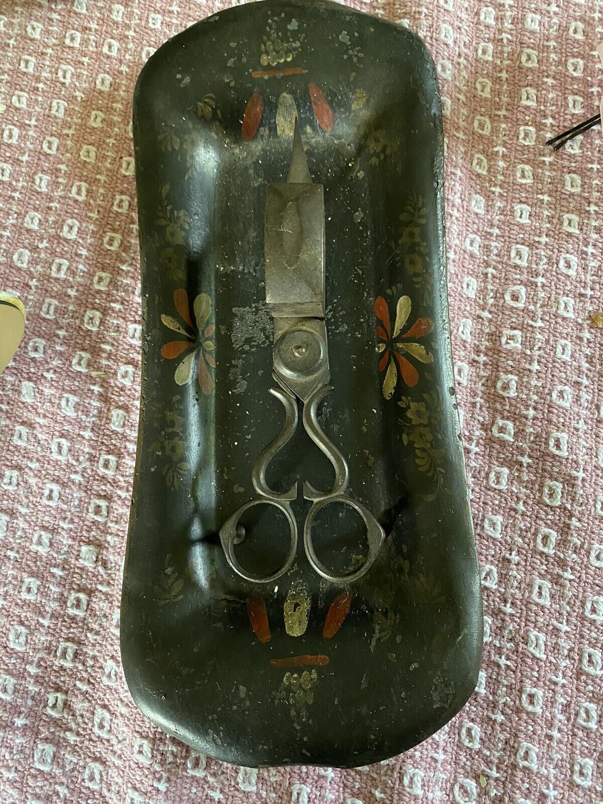 Antique Candle Wick Scissors Trimmer Snuffer with Tray Hand Painted Desi