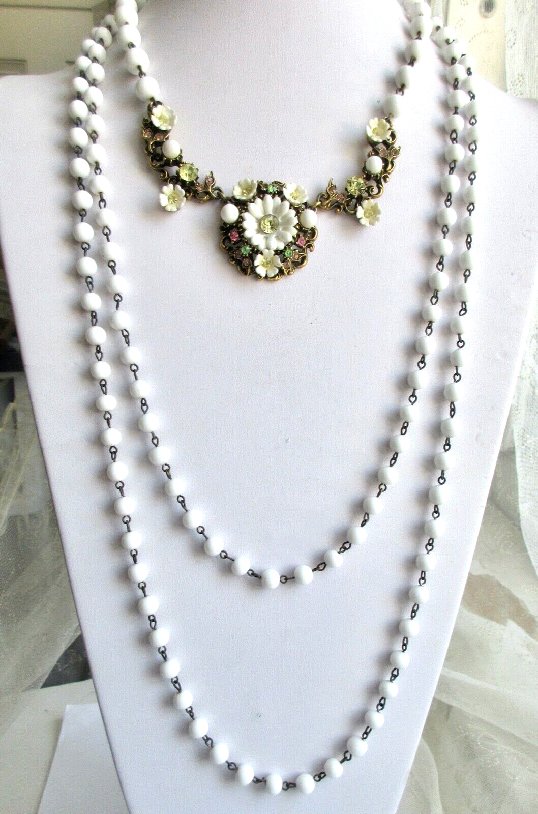 Vintage WHITE MILK GLASS Beads Rhinestones FLORAL NECKLACE LOT Unsign Hollycra