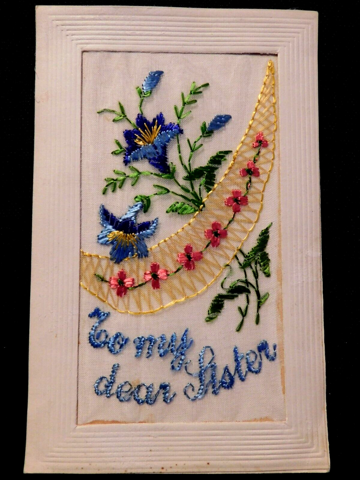 Antique embroidered with satin postcard To my sister with flowe