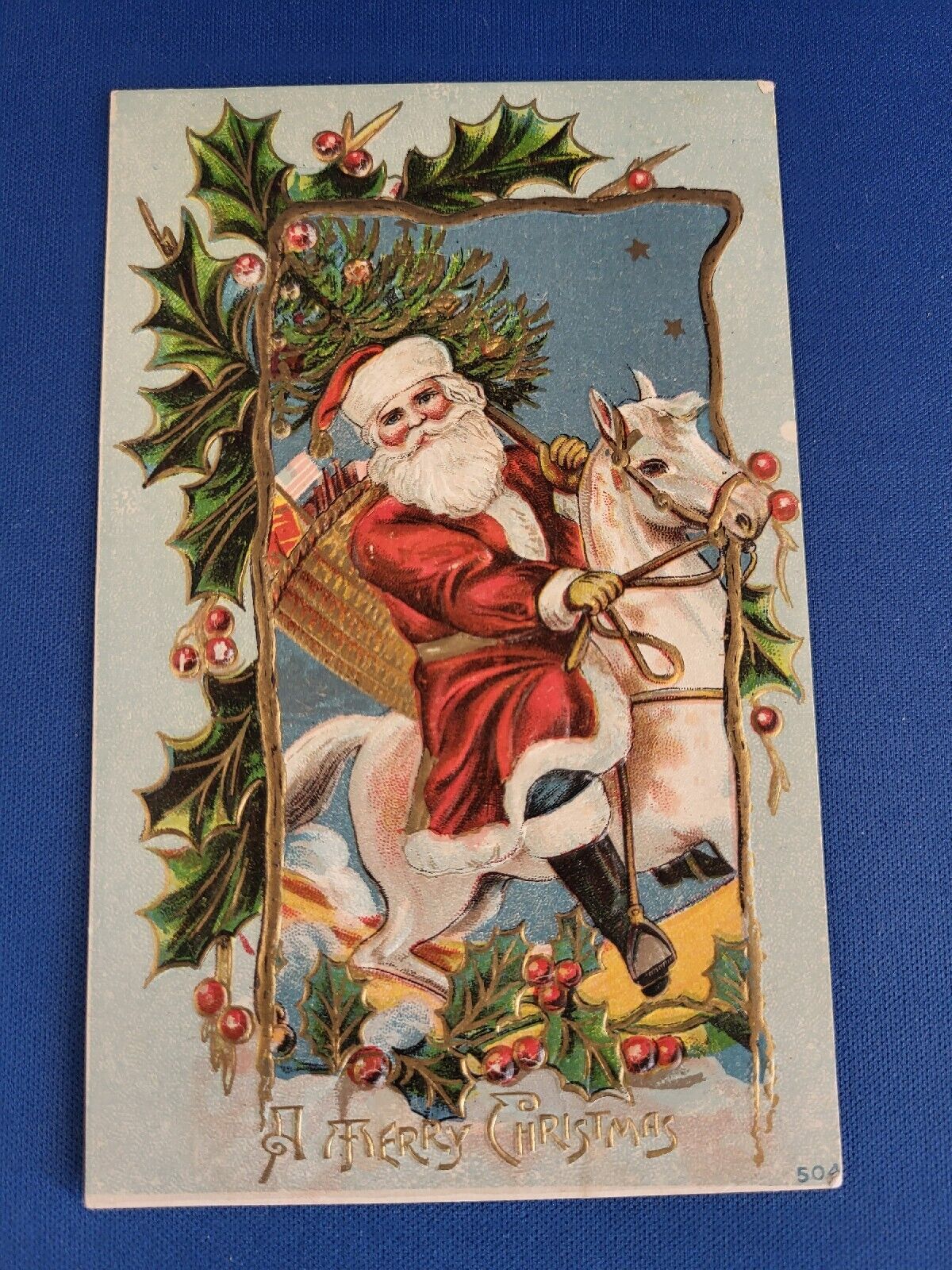 Title (ebay affiliate link): Antique Embossed Christmas Post Card Dated 1912. Santa Claus Riding a White.