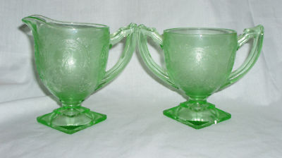 GREEN HORSE SHOE DEPRESSION GLASS CREAM & SUGAR SET
