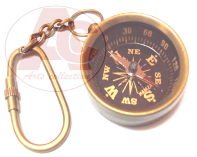 BRASS ANTIQUE POCKET COMPASS KEY CHAIN KEY RING