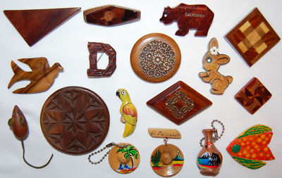 Title (ebay affiliate link): Lot of 15 Vintage Wood Brooches Pins 2 Key Chains
