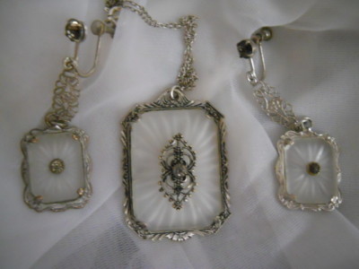 Antique Victorian Satin Glass Sterling Pendant, Earring