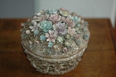 Title (ebay affiliate link): Majolica CAPODIMONTE Flower Covered Box w Lid 2 Tags VG