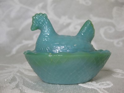 Blue and Green Milk Glass Hen Chicken Rooster on Nest